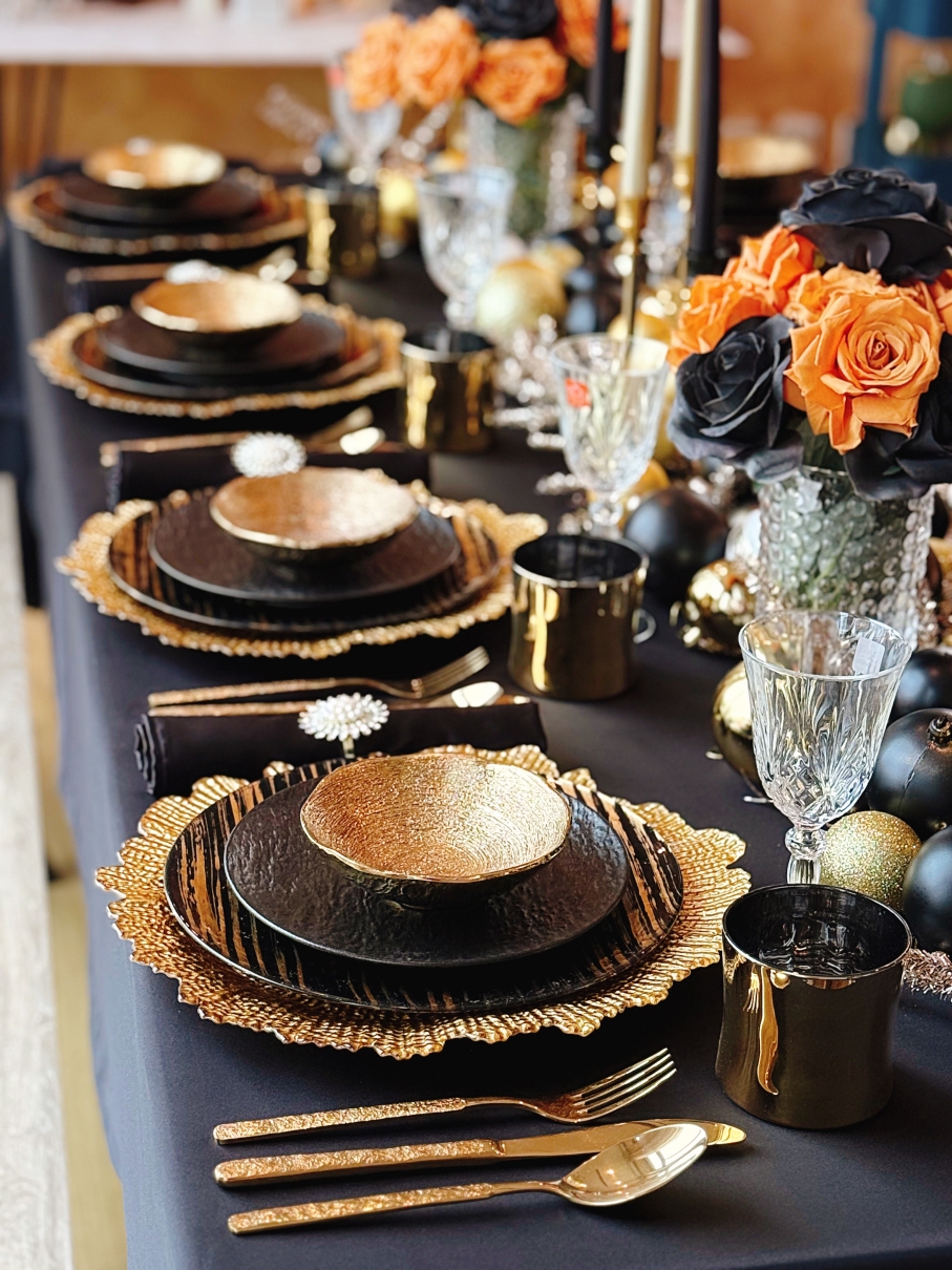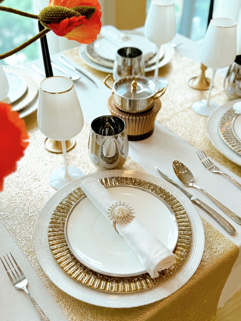 Dụng cụ ăn uống: Đây là lúc bộ dao nĩa màu vàng gold phát huy tác dụng. Kết hợp với bát đĩa màu trắng tinh khôi hoặc bộ sứ viền quạt trắng sẽ tạo nên sự tương phản vô cùng tinh tế.